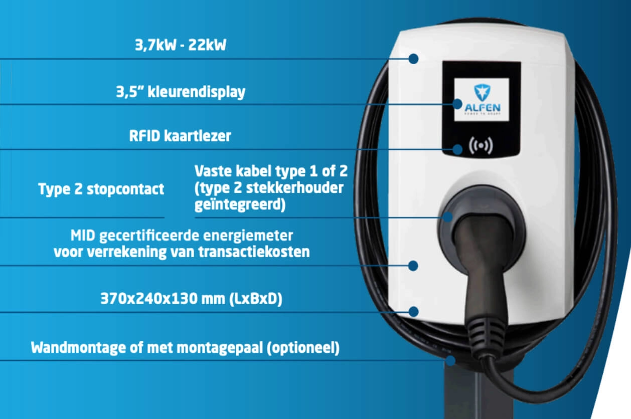 De Alfen Eve Single Pro-line is een compacte, intelligente lader met een hoog laadvermogen van 22 kW en een vaste laadkabel. Hiermee hoeft u dus nooit meer te zoeken naar de laadkabel in de kofferbak. Dankzij Plug & Charge start het laadproces direct na het aansluiten. U kunt de Alfen Eve Single Pro-line aan een paal monteren (als laadpaal) of aan de wand (wandlader). Bij aanschaf van de Eve Single Pro-Line kunt u ook nog optioneel 6 maanden gratis gebruik maken van het E-Flux backoffice systeem.