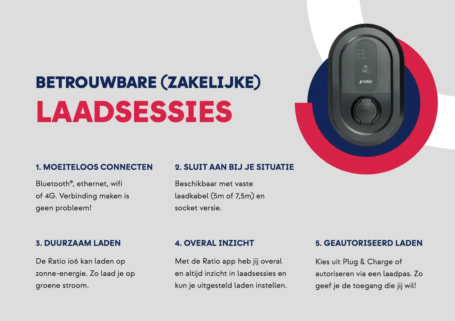 De Ratio io6 is een zeer complete laadpaal met een hoog laadvermogen van 22 kW. Deze lader maakt het bij een zonne-energie overschot van 1,4 kW al mogelijk om te laden vanuit de zonnepanelen. Daarnaast kunt u met deze lader ook nog de laadkosten automatisch laten verrekenen via een backoffice systeem.